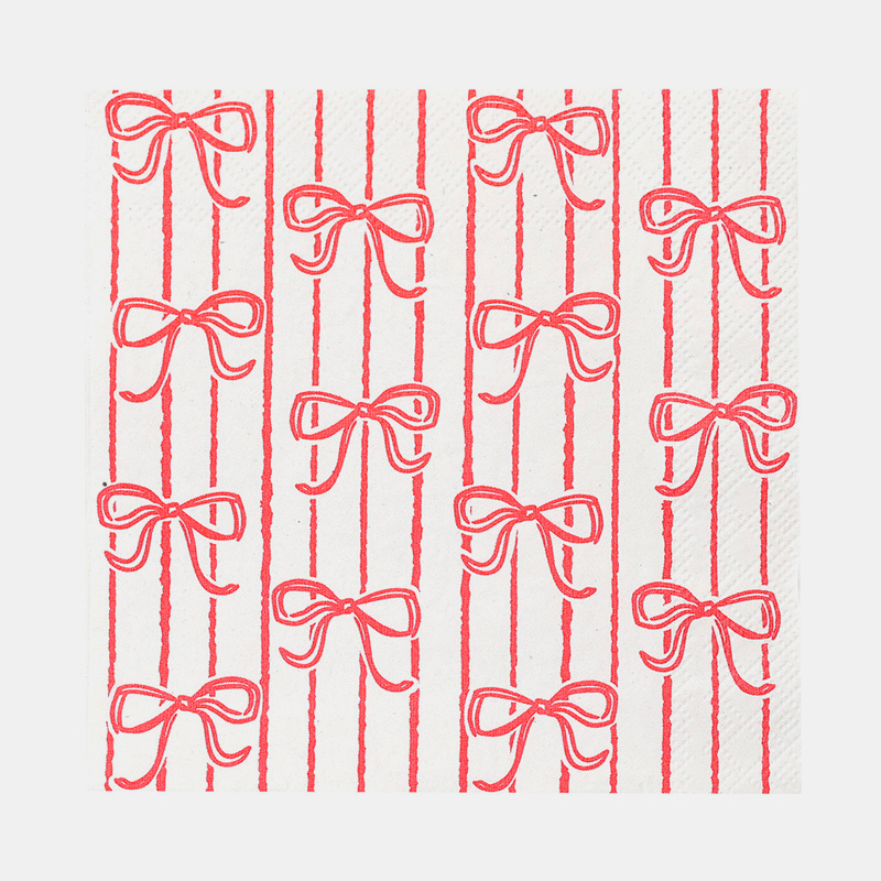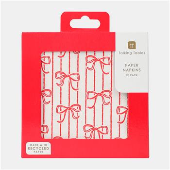 Servilletas de papel blanco con estampado de lazos rojos y rayas tipo bastón de caramelo. Perfectas para añadir un toque divertido y festivo a la mesa en Navidad, San Valentín o celebraciones invernales. FSC y 100% reciclables. Tamaño: 25 x 25 cm Pack: 20 + 1 extra Producto y embalaje: Reciclables