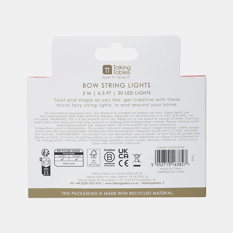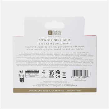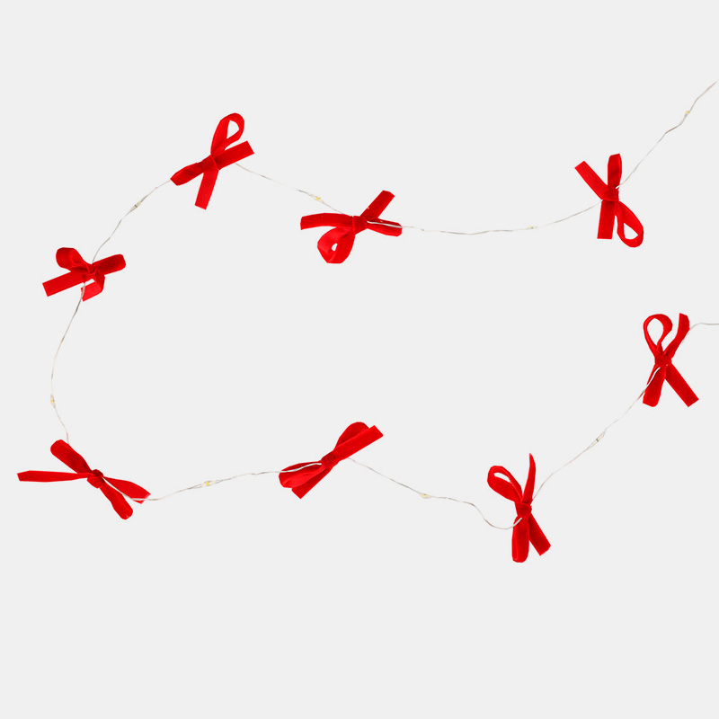 Cadena de luces LED cálidas con lazos de terciopelo rojo. Ideal para decorar mesas, estanterías o ventanas con un toque elegante y festivo. Tamaño: 1,5 m Material: Plástico Producto: Reutilizable Embalaje: Reciclable