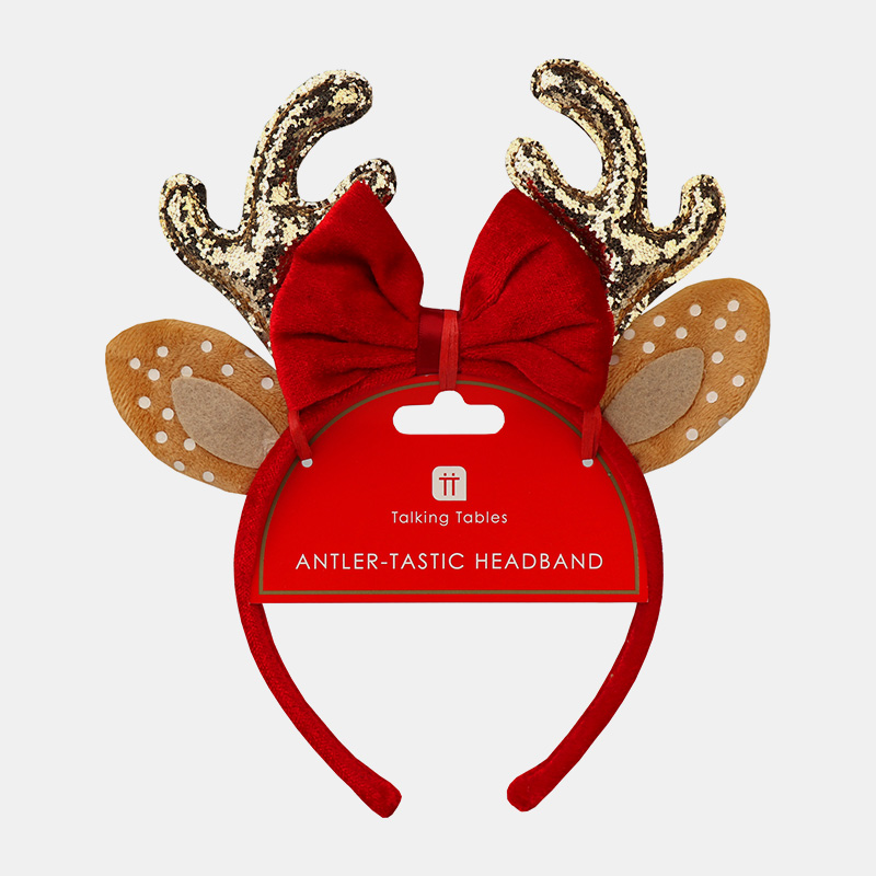 Diadema con orejitas marrones, lazo rojo y cuernos de reno con purpurina dorada. Ideal para niños o adultos, fiestas, fotos o disfraces navideños. Talla única Material: Poliéster Producto: Reutilizable Embalaje: Reciclable