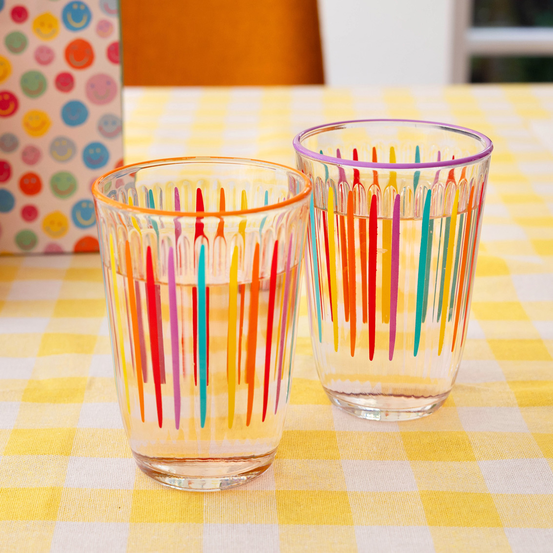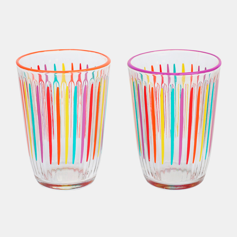 Dale un toque vibrante a tu mesa con estos vasos altos de cristal con rayas multicolor. Con su diseño de rayas verticales en tonos arcoíris y su forma alta y estilizada, son perfectos para servir cócteles de verano, zumos o agua. Su estilo alegre y contemporáneo los convierte en la opción ideal para comidas diarias o celebraciones especiales.