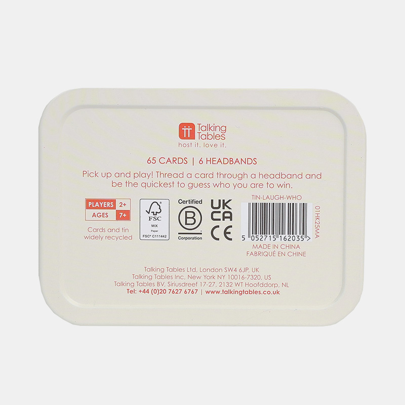 Un clásico juego de adivinanzas (WHO I AM) en versión compacta y lista para llevar a cualquier parte. Esta divertida lata incluye 65 cartas de personajes –desde iconos de la televisión hasta figuras de ficción y leyendas– junto con 6 cintas para sujetar las cartas en la cabeza.