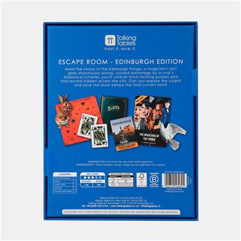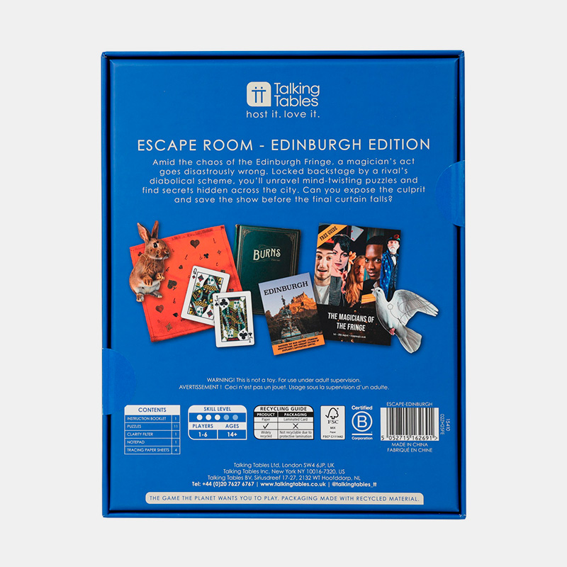 Vive la emoción del Festival Fringe de Edimburgo con este juego de escape en formato compacto. El tiempo apremia: tendrás que unir pistas y resolver secretos inspirados en las calles históricas de la ciudad. Puedes jugar solo o en equipo con amigos, y disfrutar de 60 minutos llenos de misterio, suspense y pensamiento rápido para descubrir al mago rival… sin salir de casa.