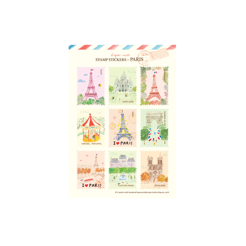 Set de 9 adhesivos, cada uno con una imagen de un monumento o vista típica de la ciudad.