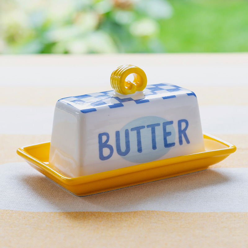 Plato de cerámica para mantequilla de Talking Tables, perfecto para servir, conservar o presentar la mantequilla de forma elegante en la mesa. Su diseño práctico y decorativo lo convierte en un accesorio ideal tanto para el desayuno como para comidas y cenas con invitados. También puede utilizarse para presentar quesos, salsas o pequeños aperitivos, aportando un toque de estilo a cualquier ocasión.