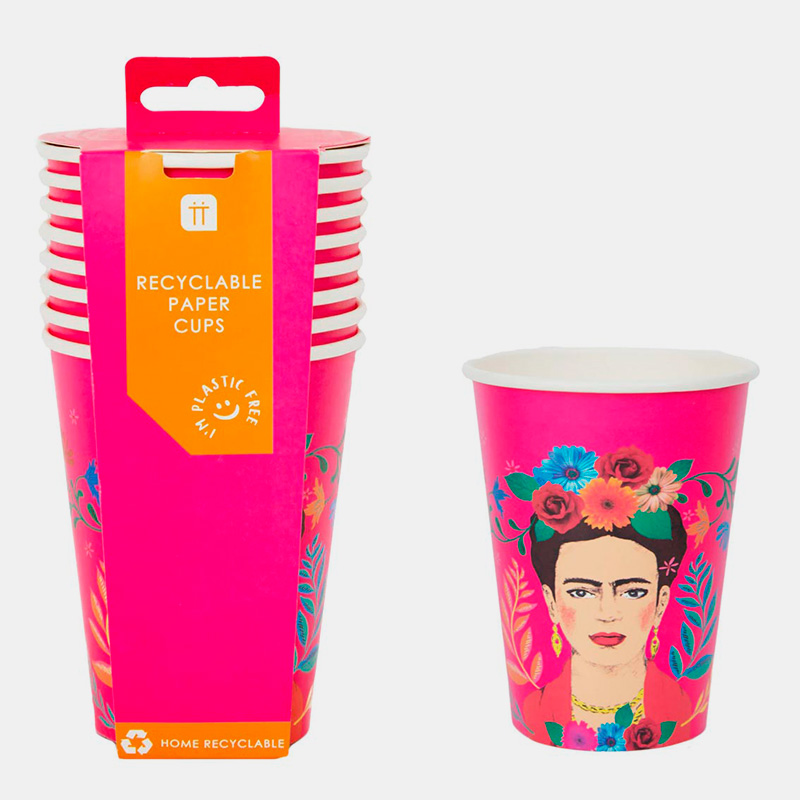 ¡Llamando a todos los fans de Frida Kahlo! Estos vasos de fiesta en rosa vibrante con estampado de Frida Kahlo son ideales para una fiesta mexicana, celebraciones de Cinco de Mayo, un cumpleaños boho o una barbacoa de verano. Combínalos con nuestras decoraciones, vajilla y accesorios de Frida Kahlo para completar el look. Cada paquete contiene 8 vasos de papel. Capacidad: 340 ml (12 oz).