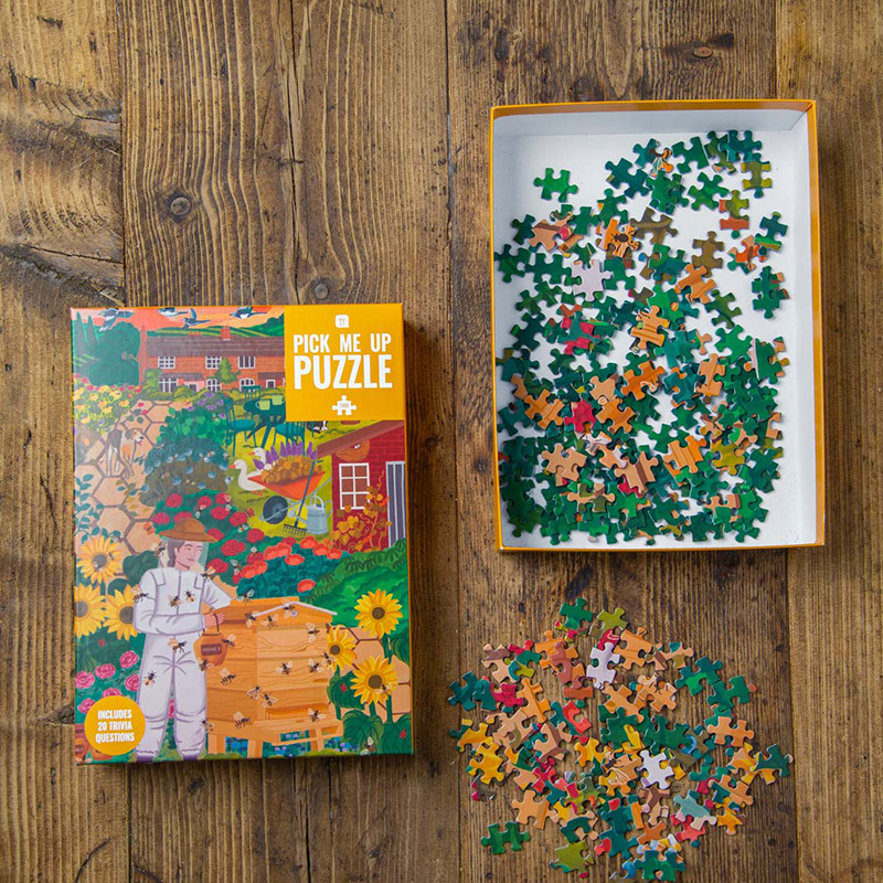 Las abejas siguen siendo una tendencia muy popular en moda y regalos, y este rompecabezas “Bee Garden” de 1000 piezas incorpora este tema dentro de la exitosa colección Pick Me Up. En tonos cálidos, el puzzle presenta una ilustración detallada de un apicultor recogiendo miel de una colmena en su jardín, rodeado de abejas trabajando.