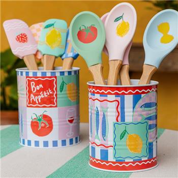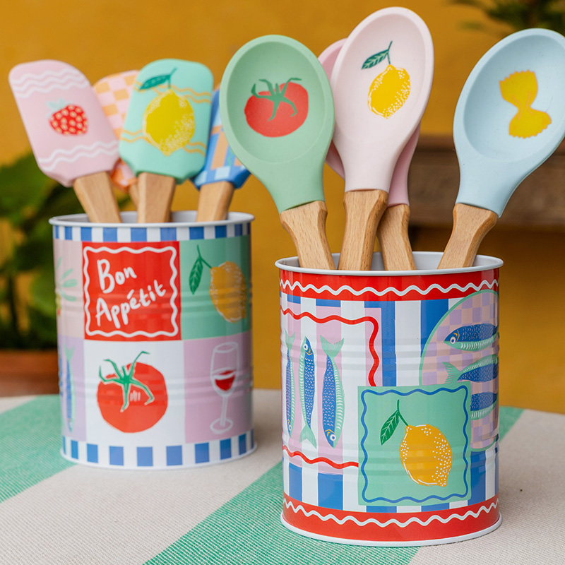 Parte de la colección Bon Appetit, este set de 16 utensilios de cocina combina practicidad y personalidad. Cada utensilio tiene una cabeza de silicona segura para alimentos con ilustraciones de frutas y alimentos (limones, tomates, fresas) y un mango de madera FSC® en colores vibrantes y a la moda. El set incluye cucharas y espátulas; la espátula flexible facilita raspar sartenes o cuencos, mientras que la cuchara es perfecta para remover o servir. Todos los utensilios son resistentes al calor hasta 230?°C (450?°F) y diseñados para uso diario.