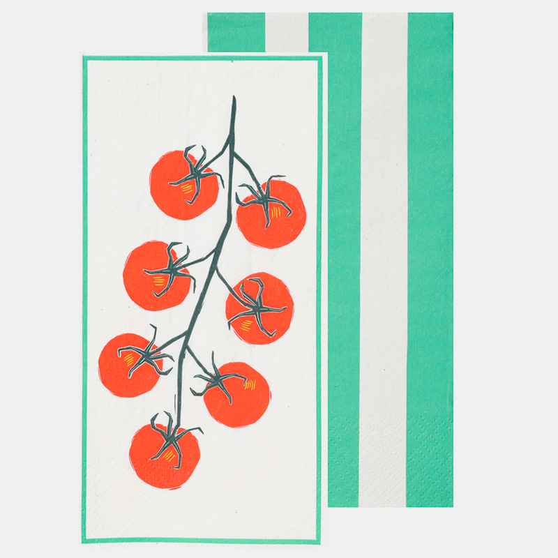 Parte de la colección Bon Appetit de Talking Tables, estas servilletas de papel tomate Long Lunch continúan con la tendencia de productos inspirados en limones. Su diseño combina motivos cítricos y tonos amarillos frescos, evocando cenas mediterráneas y entretenimiento veraniego relajado. Fabricadas en 100% papel FSC® reciclado, las servilletas de mayor tamaño (40?cm) incluyen dos diseños coordinados: uno con ilustración de limón y otro con rayas limpias, ofreciendo flexibilidad para decorar la mesa. Perfectas para crear una atmósfera alegre y soleada en cualquier ocasión.