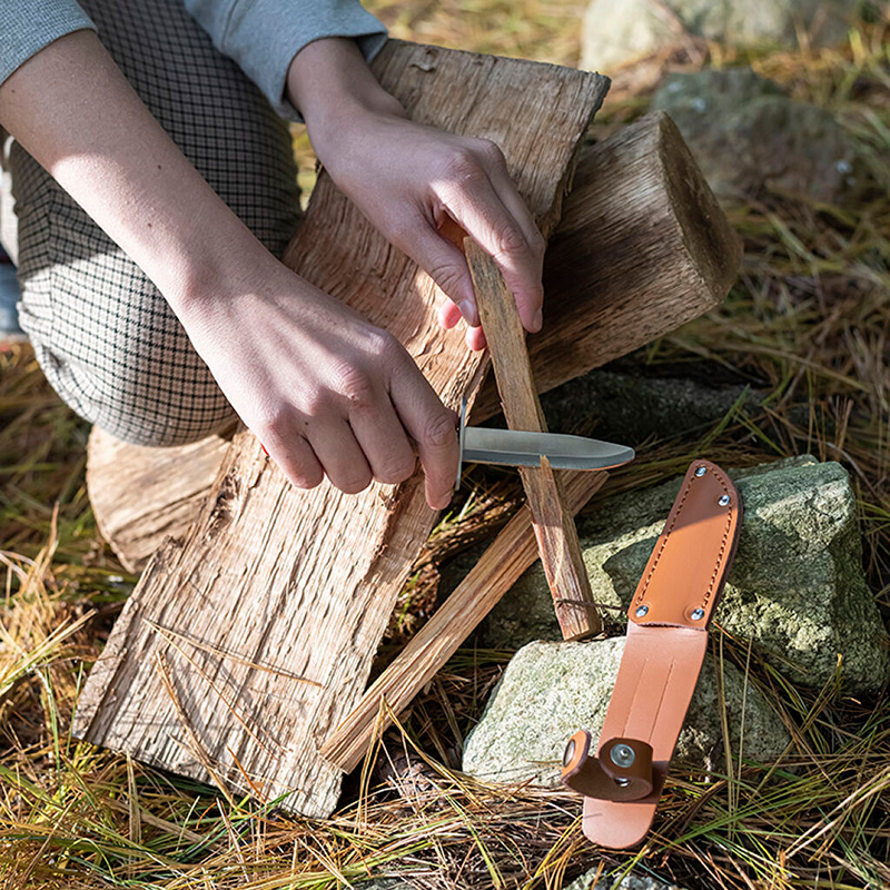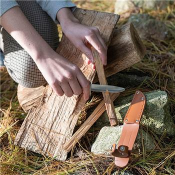 Cuchillo de explorador inspirado en el diseño tradicional sueco, con funda para sujetarlo al cinturón o a la mochila.