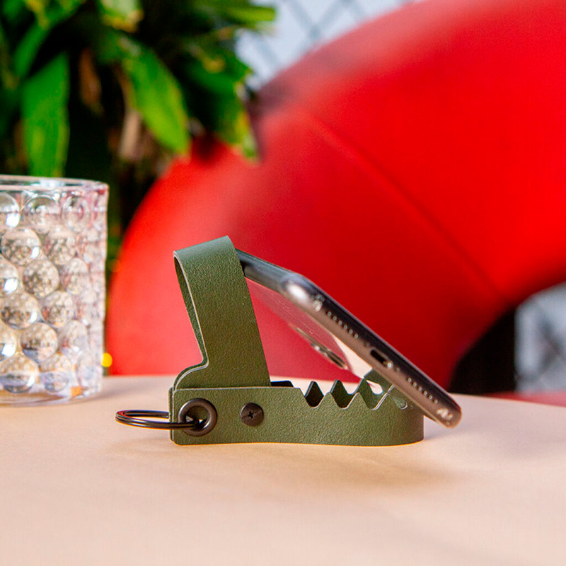 Soporte plegable para teléfono en modo vertical u horizontal, compacto y fácil de llevar en el llavero.