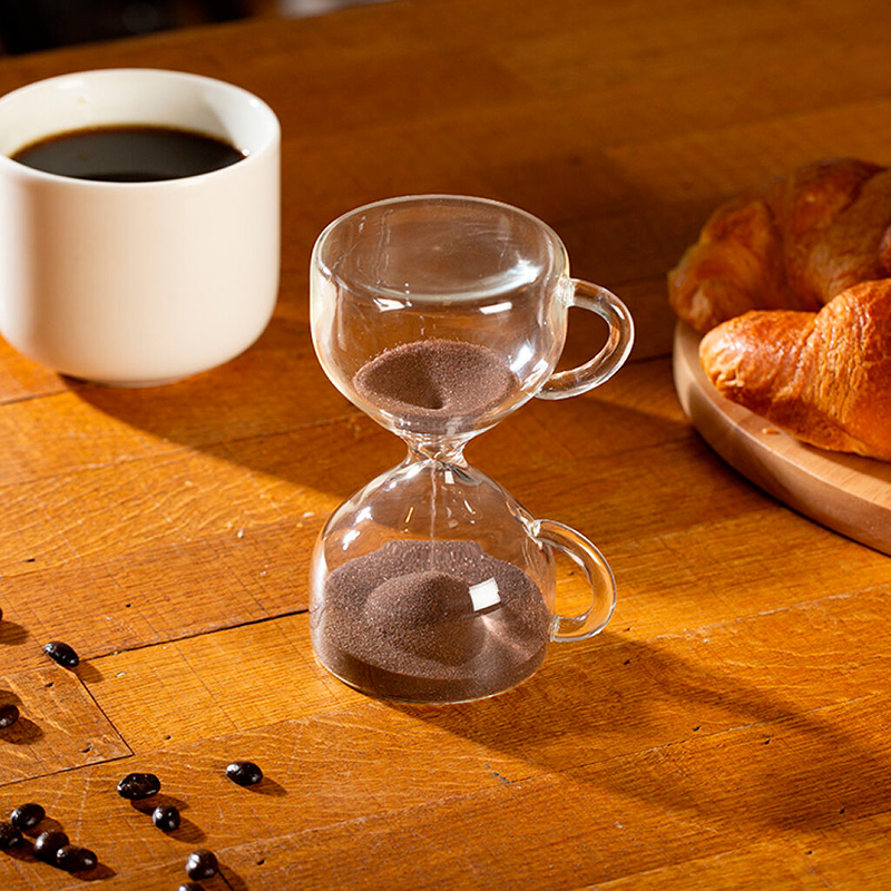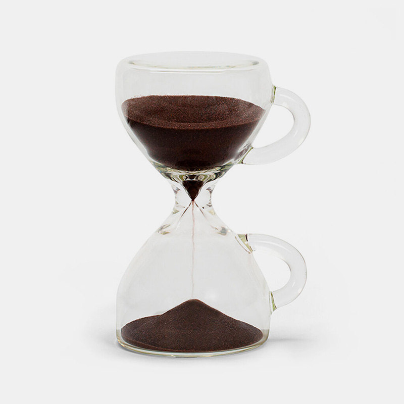 Reloj de arena con “arena de café” que marca una pausa perfecta de 15 minutos.