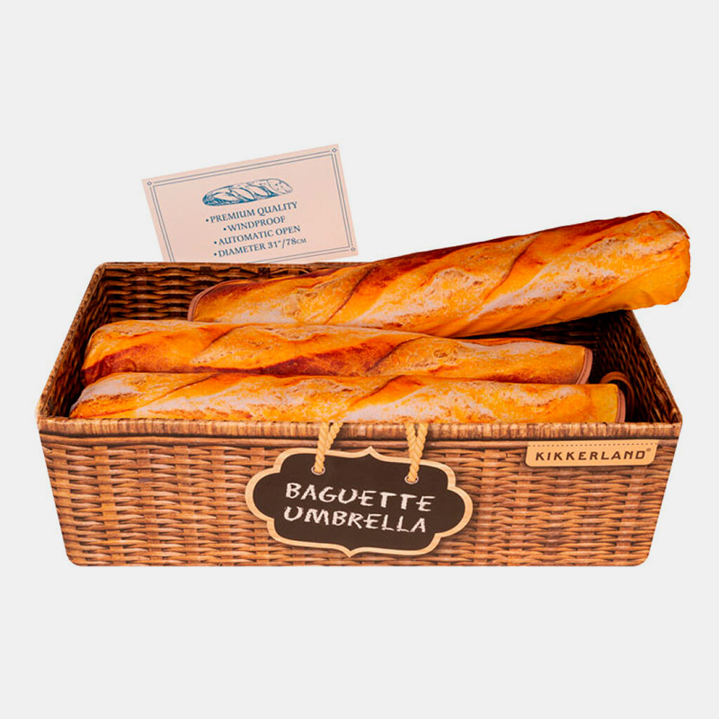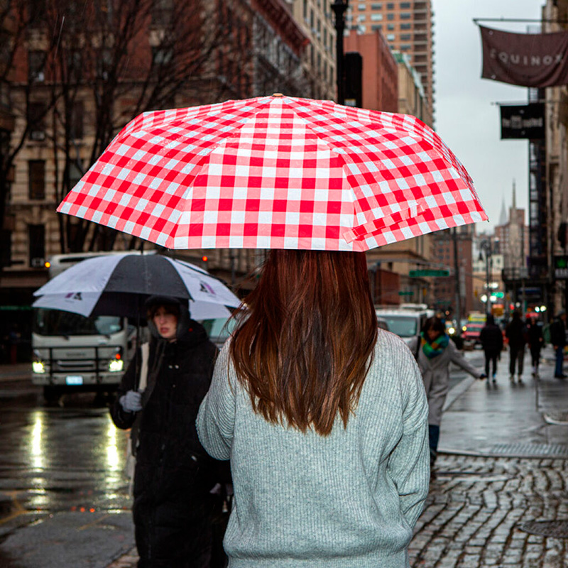 Paraguas compacto, duradero y resistente al viento con diseño divertido de cuadros rojos y blancos y funda con estampado de baguette.