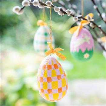 Estas decoraciones colgantes de huevo de algodón reciclado aportan un enfoque sostenible a la decoración tradicional de Pascua. Cada huevo está hecho a mano en la India