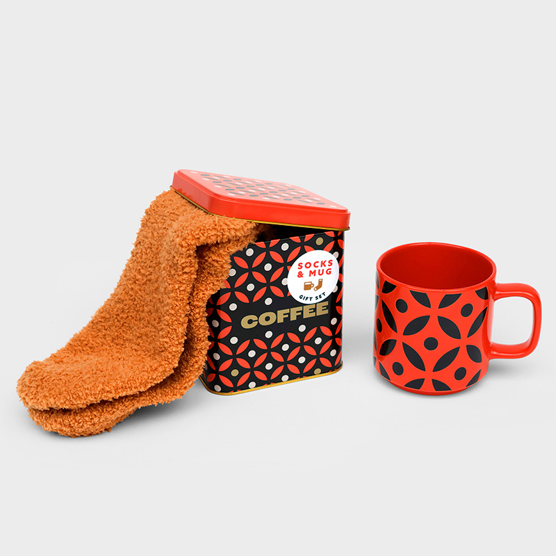 El regalo perfecto para los amantes del café. Disfruta de una taza de café caliente mientras mantienes tus pies cómodos y calentitos. Usa la lata para guardar tus bolsas de té con estilo.