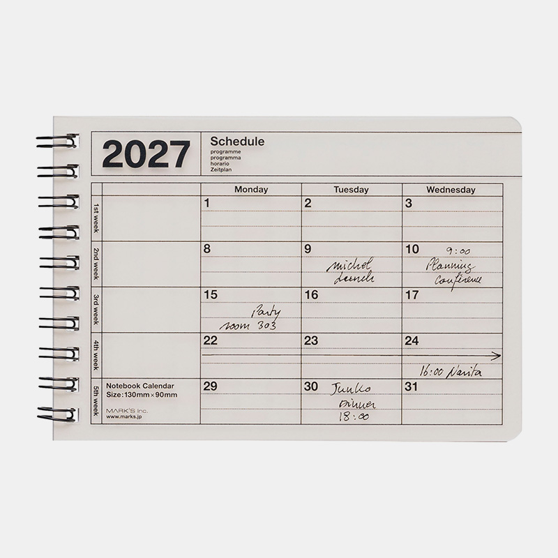Página por mes, con espacio en cada día del mes para pequeñas anotaciones. Incluye las Fiestas de 9 países marcadas en rojo.