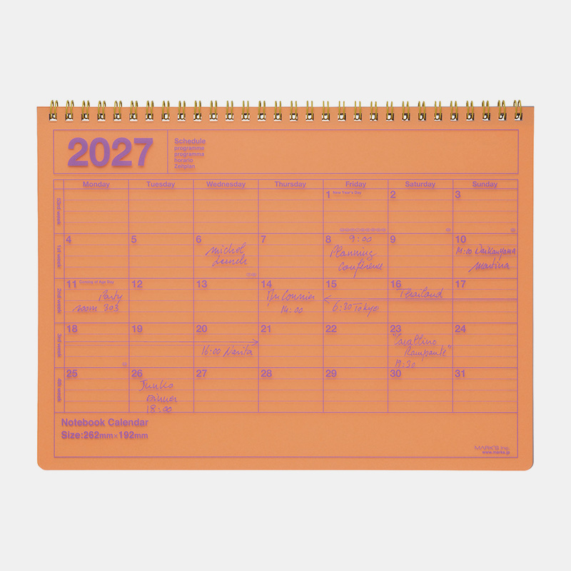 Página por mes, con espacio en cada día del mes para pequeñas anotaciones. Incluye las Fiestas de 9 países marcadas en rojo.
