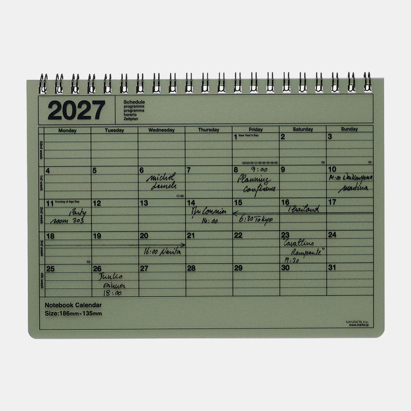 Página por mes, con espacio en cada día del mes para pequeñas anotaciones. Incluye las Fiestas de 9 países marcadas en rojo.