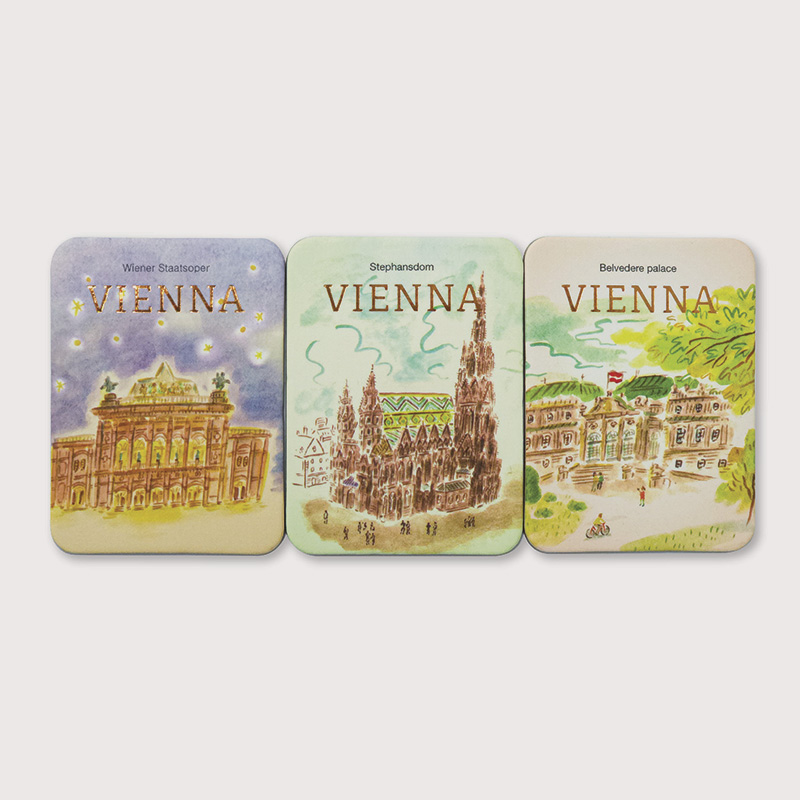 Set de 3 imanes decorativos inspirados en ciudades icónicas, perfectos para tu nevera o escritorio.