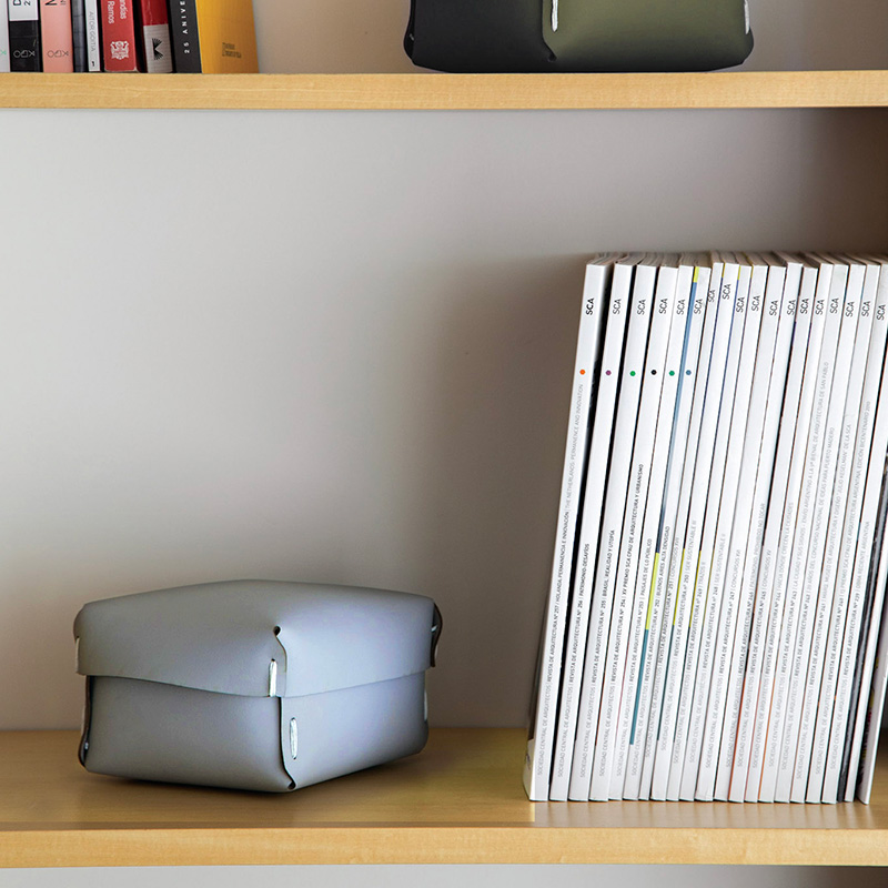 Caja mediana, multiuso, ideal para organizar y ordenar tus espacios. Es un producto sostenible y duradero, hecho a mano con cuero 100% reciclado