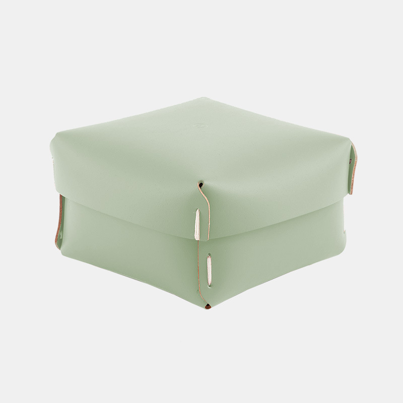 Caja mediana, multiuso, ideal para organizar y ordenar tus espacios. Es un producto sostenible y duradero, hecho a mano con cuero 100% reciclado