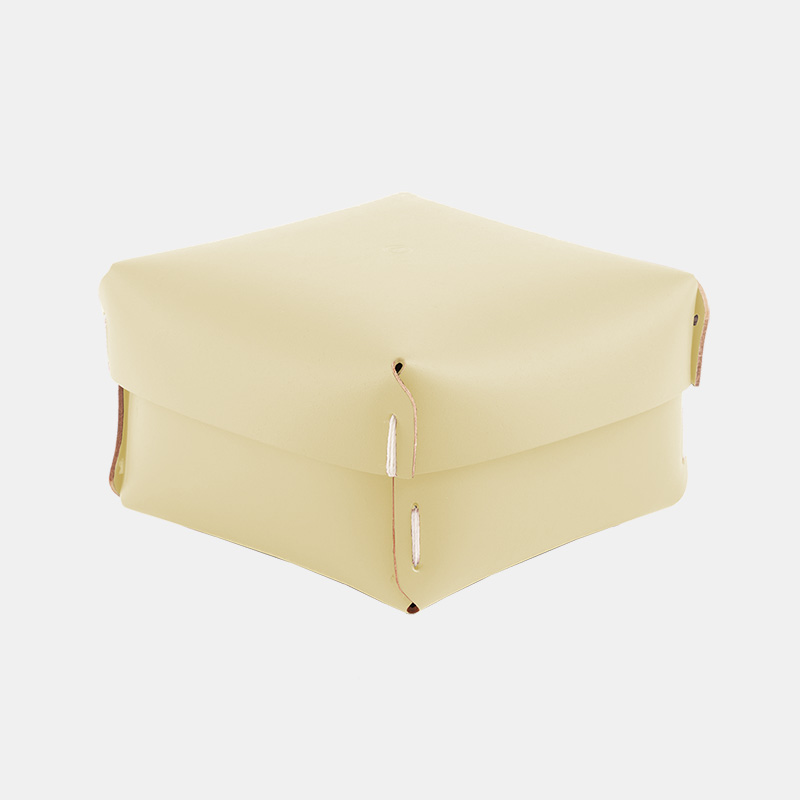 Caja mediana, multiuso, ideal para organizar y ordenar tus espacios. Es un producto sostenible y duradero, hecho a mano con cuero 100% reciclado
