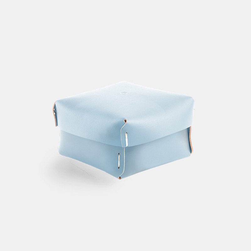 Cesta cuadrada pequeña, sobria y elegante. Es un producto sostenible y duradero, hecho a mano con cuero 100% reciclado