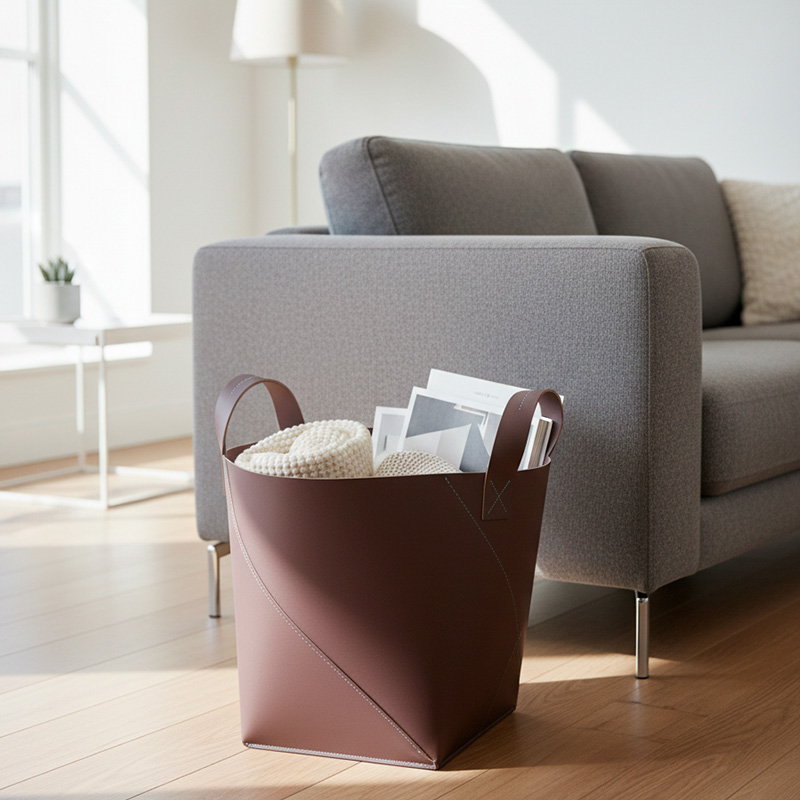 Nuestro cesto con asas L realizado en 100% cuero reciclado combina diseño y funcionalidad.Su diseño minimalista con meticulosos detalles de costura, añade un toque de sofisticación a la vez que proporciona una solución de guardado.