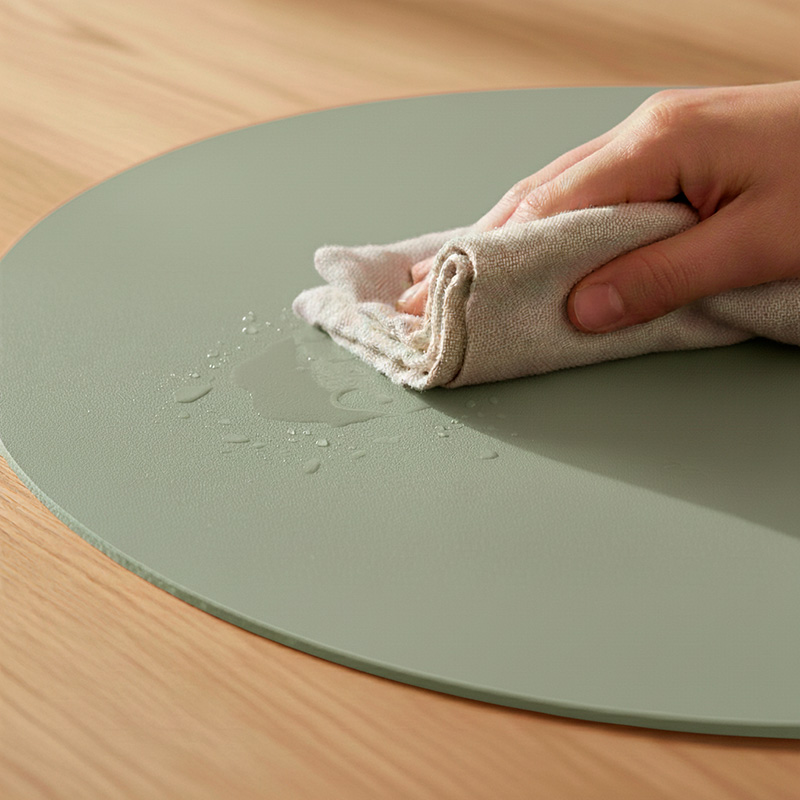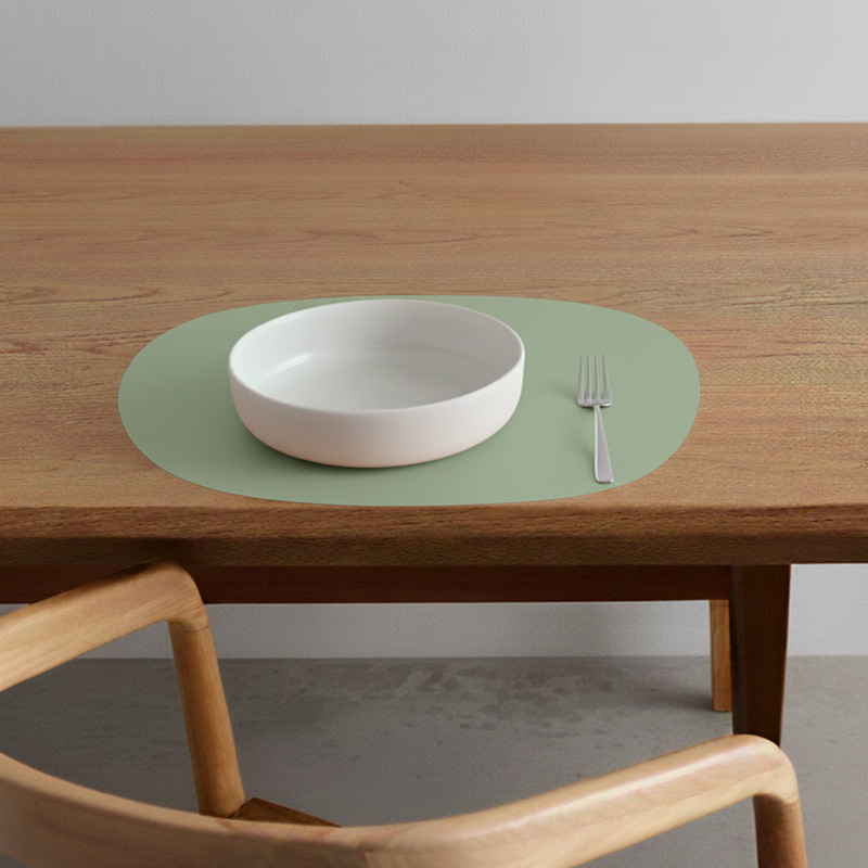 Individual de mesa práctico, sobrio y elegante con una superficie de fácil limpieza. Es un producto sostenible y duradero, hecho a mano con cuero 100% reciclado.