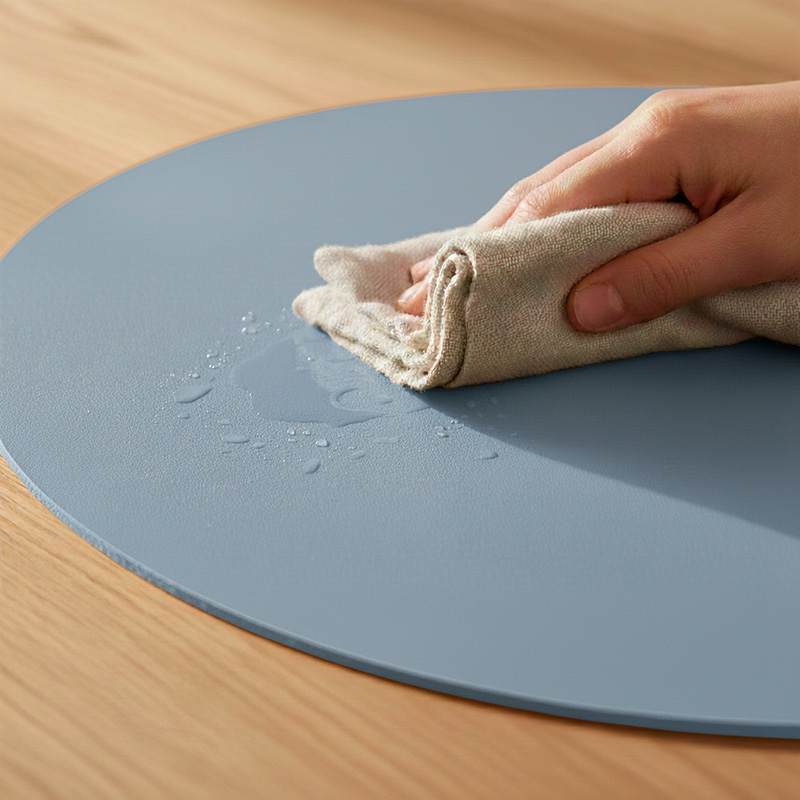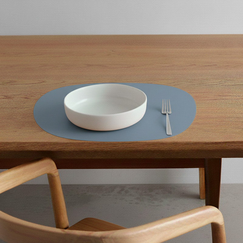 Individual de mesa práctico, sobrio y elegante con una superficie de fácil limpieza. Es un producto sostenible y duradero, hecho a mano con cuero 100% reciclado.