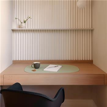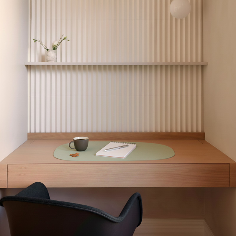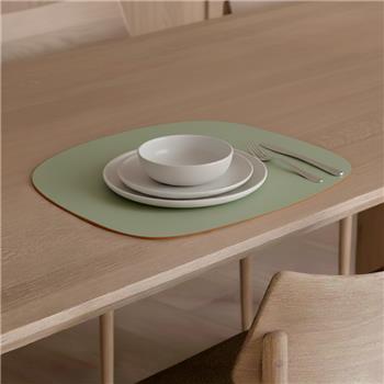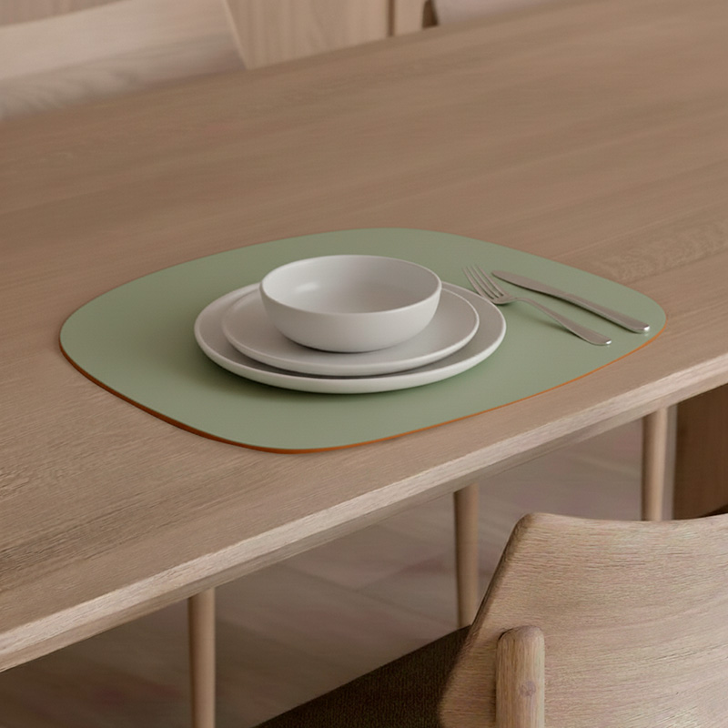 Individual de mesa práctico, sobrio y elegante con una superficie de fácil limpieza. Es un producto sostenible y duradero, hecho a mano con cuero 100% reciclado.