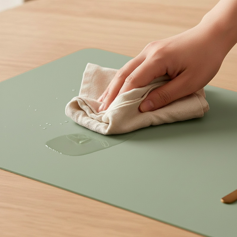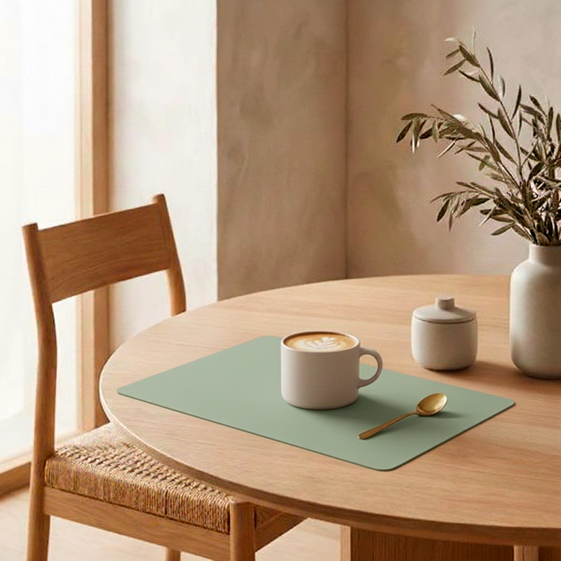 Individual de mesa práctico, sobrio y elegante con una superficie de fácil limpieza. Es un producto sostenible y duradero, hecho a mano con cuero 100% reciclado.