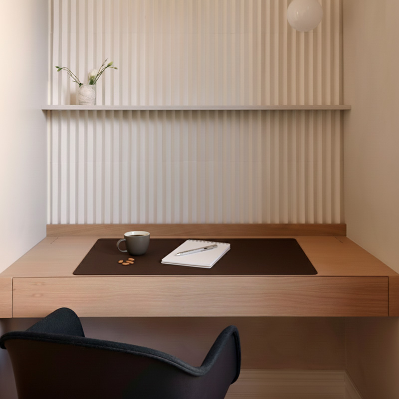 Amplio pad de escritorio, de forma piedra descontracturada, con curvas suaves y ángulos redondeados. Útil tanto en el hogar como en la oficina .Es un producto sostenible y duradero, hecho a mano con cuero 100% reciclado.