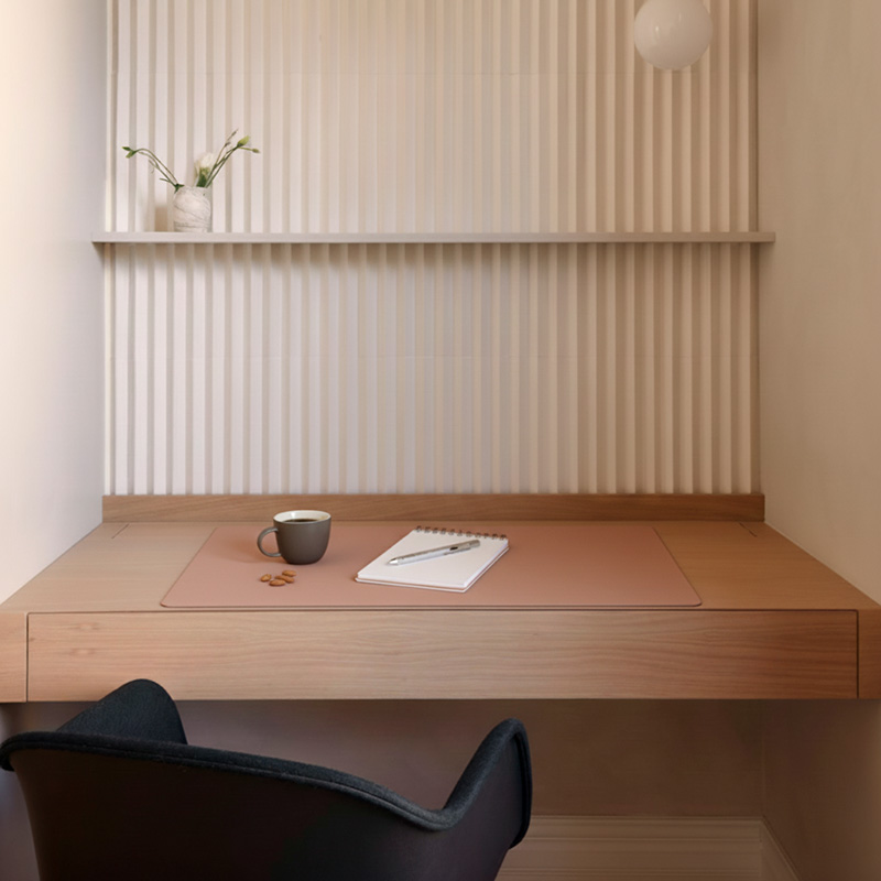 Amplio pad de escritorio, de forma piedra descontracturada, con curvas suaves y ángulos redondeados. Útil tanto en el hogar como en la oficina .Es un producto sostenible y duradero, hecho a mano con cuero 100% reciclado.