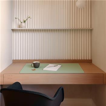 Amplio pad de escritorio, de forma piedra descontracturada, con curvas suaves y ángulos redondeados. Útil tanto en el hogar como en la oficina .Es un producto sostenible y duradero, hecho a mano con cuero 100% reciclado.