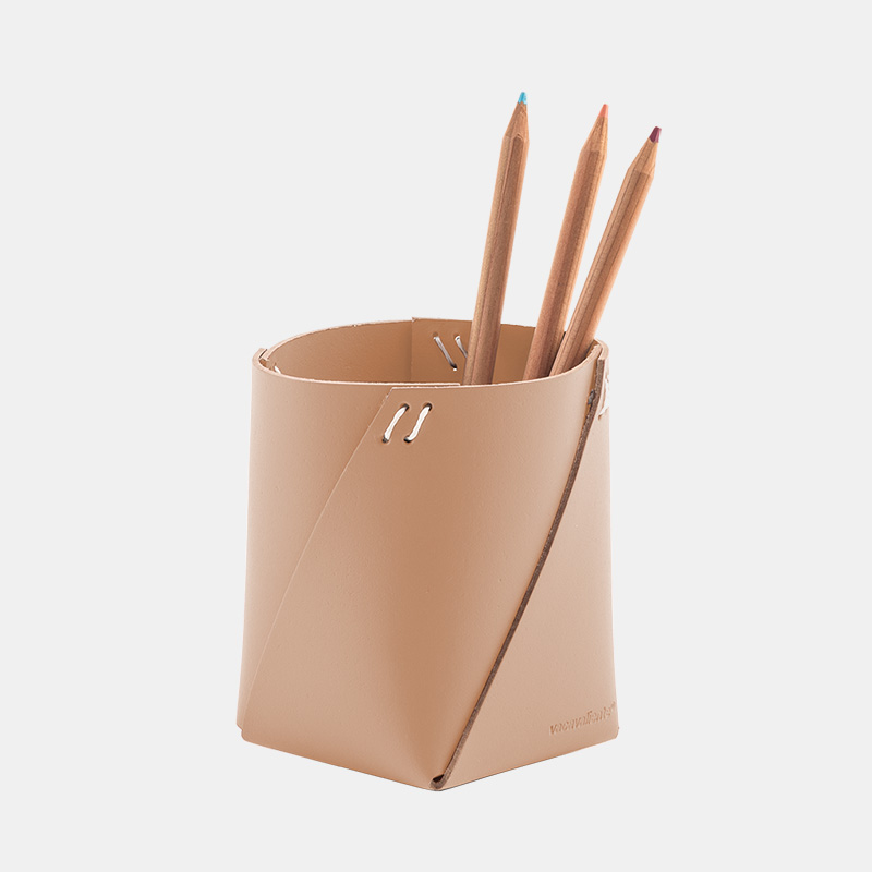 Lapicero y organizador de escritorio, sobrio, simple y estilizado. Puede usarse tanto en casa como en la oficina. Es un producto sostenible y duradero, hecho a mano con cuero 100% reciclado.