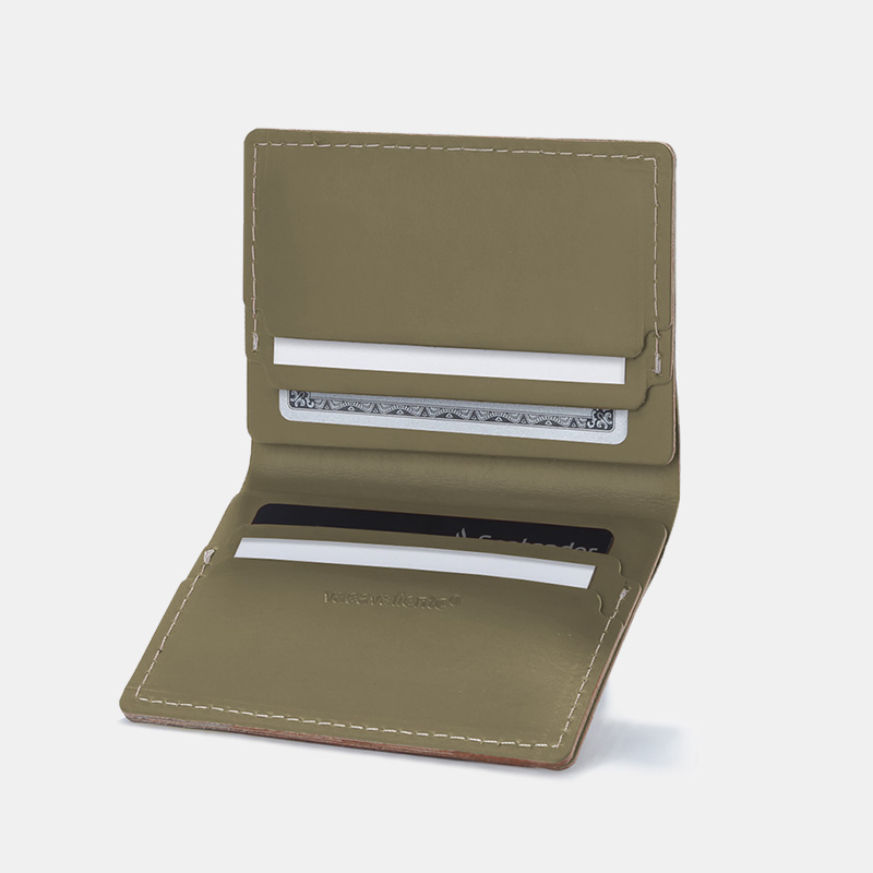 Este tarjetero doble, realizado con un diseño minimalista y agradable al tacto, es ideal para acompañarte a diario. Es un producto sotenible y duradero, hecho a mano con cuero 100% reciclado.