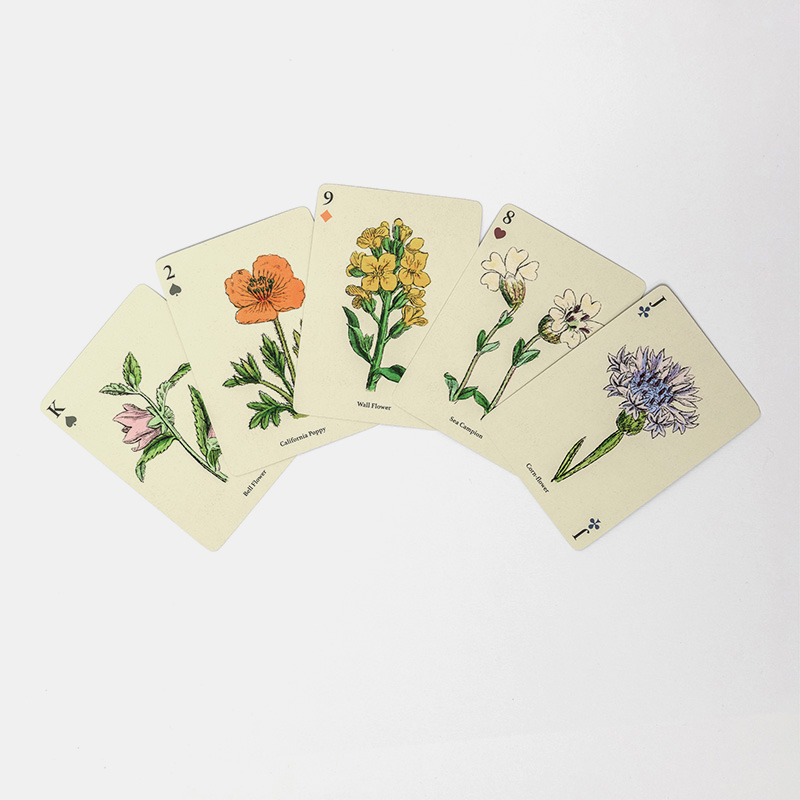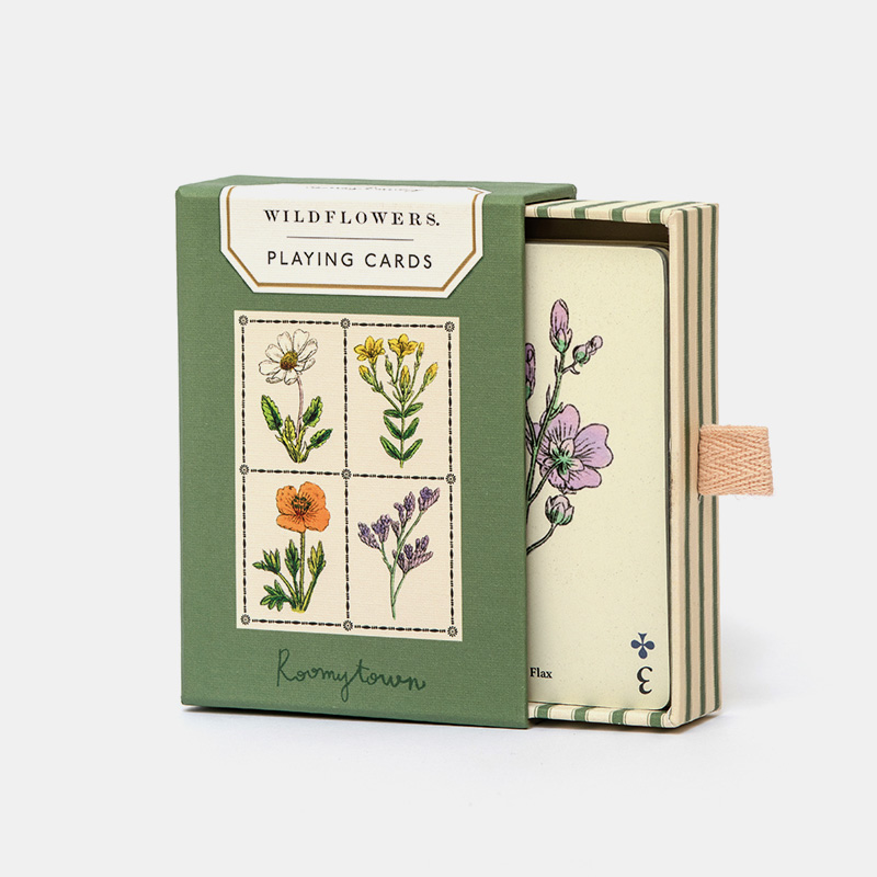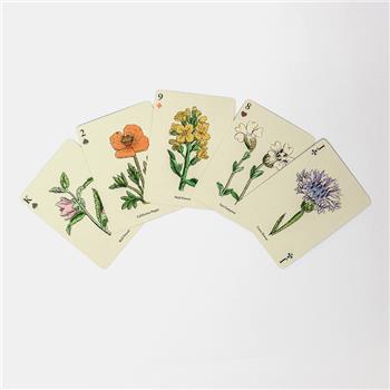 Esta baraja de 52 cartas presenta intrincadas ilustraciones de flores silvestres, originalmente publicadas en un libro de John E. Sowerby en 1902. El libro antiguo se describía como un volumen de referencia para botánicos de campo, residentes rurales o excursionistas de verano para identificar cada planta. El equipo de diseño de Roomytown en Bath, Reino Unido, seleccionó cuidadosamente las ilustraciones más cautivadoras de esta joya antigua para crear esta baraja de cartas única, con cada carta diseñada individualmente.
