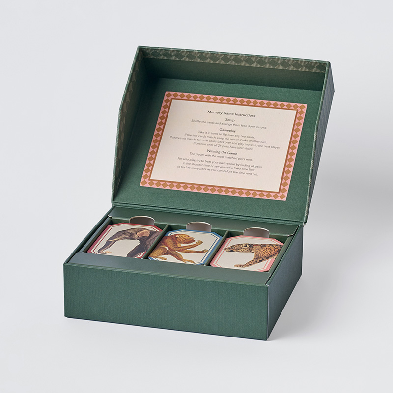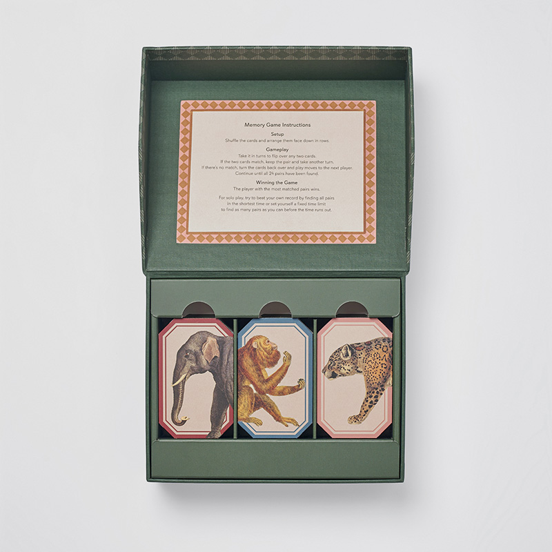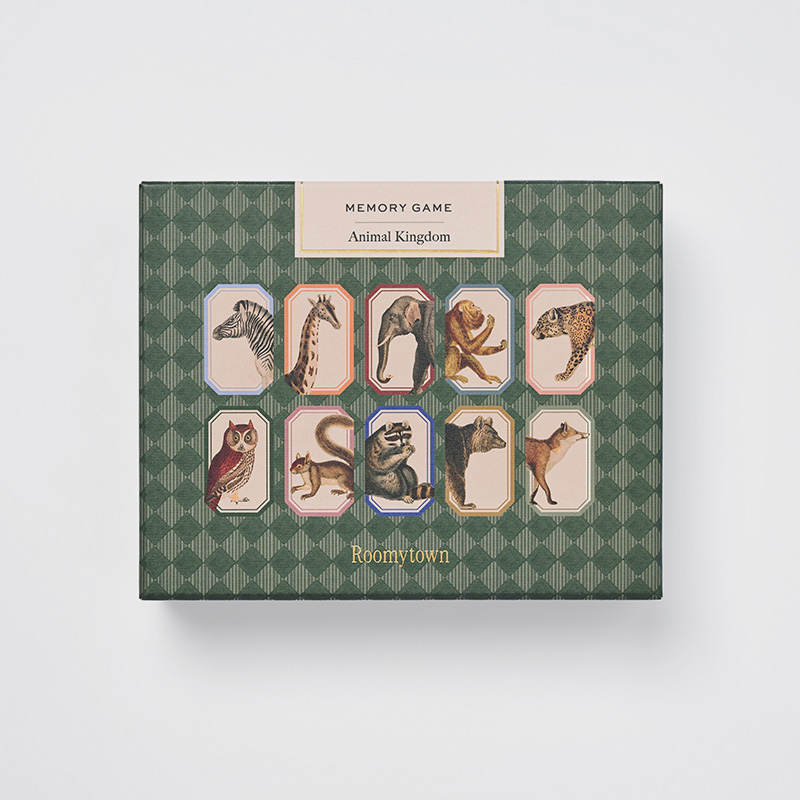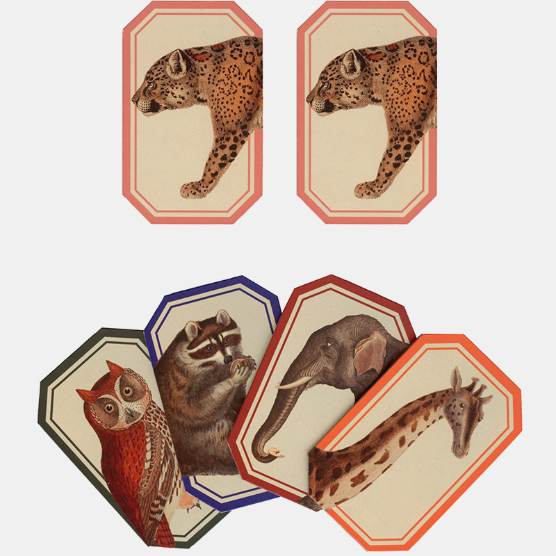 Este juego de memoria Reino Animal incluye 24 pares de cartas con formas especiales, que presentan increíbles ilustraciones vintage de animales del mundo natural, recopiladas de libros antiguos. El equipo de diseño de Roomytown en Bath, Reino Unido, adaptó y mejoró cuidadosamente las obras originales, aplicándolas a cada carta para crear un elegante juego de memoria que pone a prueba tus habilidades de observación.