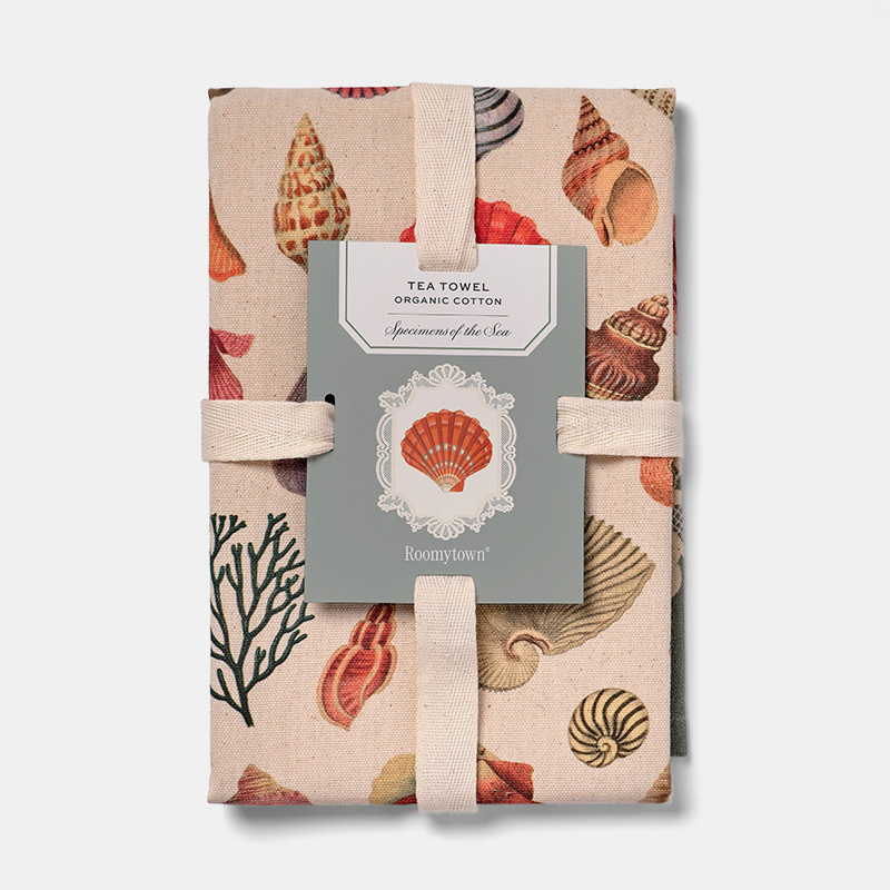 Este paño de cocina 100% algodón orgánico presenta detalladas ilustraciones de especímenes marinos extraídas de libros de historia natural del siglo XVIII. Cada concha y criatura marina ha sido cuidadosamente restaurada y adaptada por el equipo de diseño de Roomytown, y enmarcada con un delicado motivo de encaje inspirado en los primeros gabinetes de curiosidades. El resultado es una composición refinada y discretamente impactante que celebra la belleza, el misterio y la fascinación científica de los primeros registros del océano.