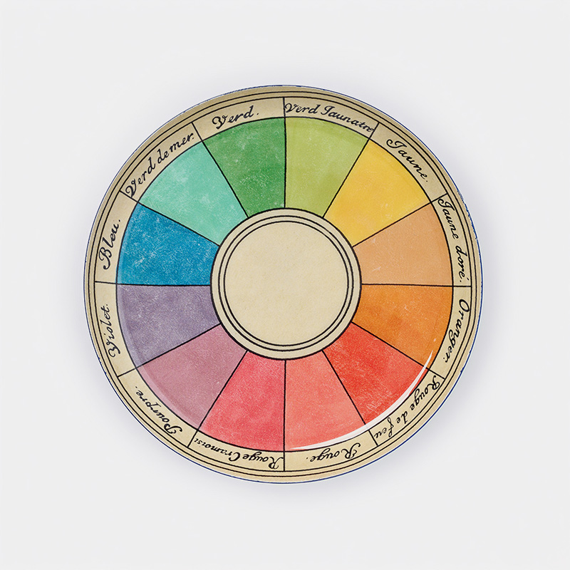 Esta bandeja redonda de metal esmaltado de 20,5 cm presenta un diseño vintage de rueda de color, publicado por primera vez en 1708. Adaptado del cercle chromatique de Claude Boutet, una de las ruedas de color más antiguas registradas, la obra muestra una disposición armoniosa de colores primarios, secundarios y terciarios, representando un hito en la historia de la teoría del color. Restaurada y mejorada cuidadosamente por nuestro equipo de diseño, esta bandeja compacta aporta un vibrante toque de historia del arte a la vida cotidiana.