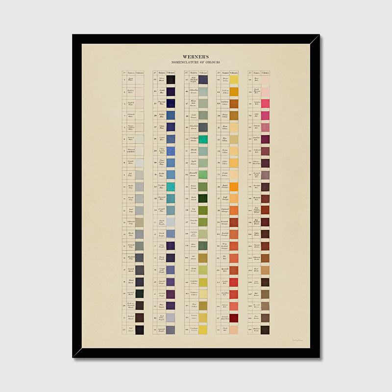 Esta lámina Fine Art con marco de madera negra está hecha a mano sobre papel artístico mate de 200 g/m² de alta calidad, preservando todas las variaciones tonales y la delicadeza del estudio histórico de Nomenclatura de colores de werner. Cada pieza es única, elaborada artesanalmente por nuestro equipo para garantizar una reproducción fiel y duradera. Tamaño 16 x 20